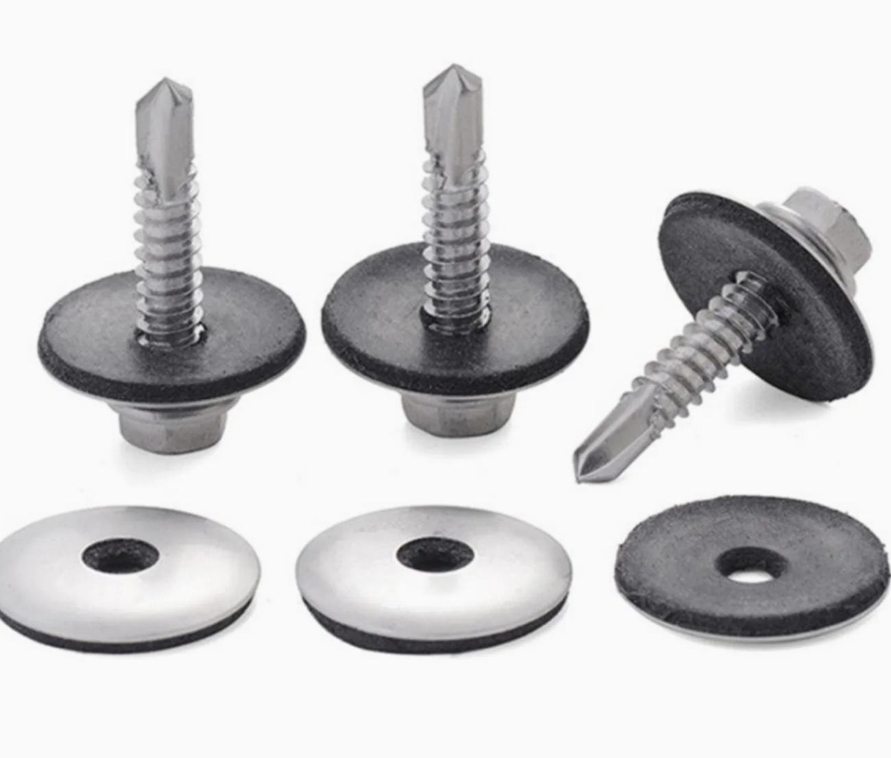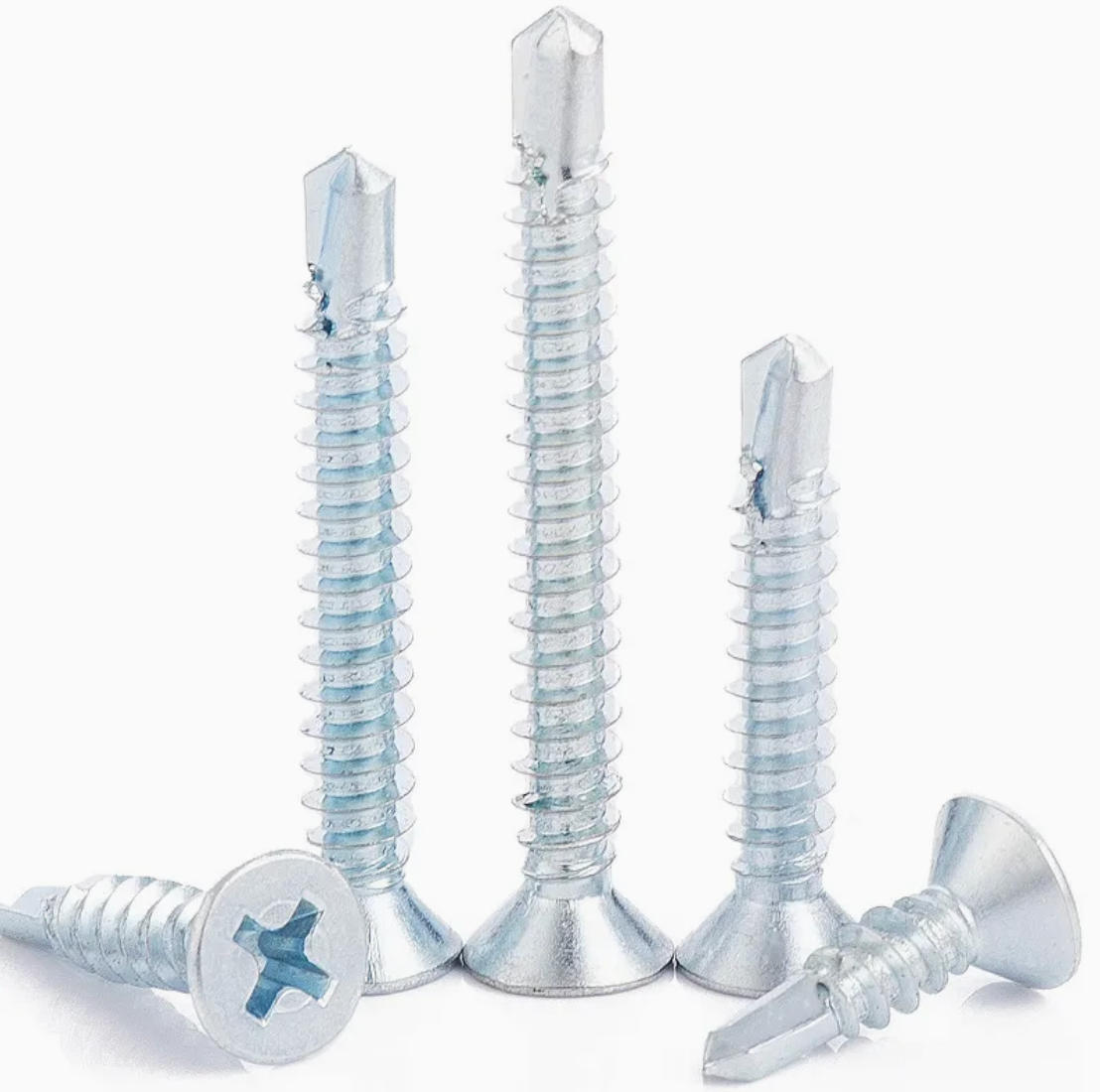 Self drilling screws are a commonly used variety of screw for quick drilling into both metal and wood. A self drilling screw can typically be identified by its point and flute (notch) tip. This tip acts as a drill bit for the screw making it much faster to install then having to switch between a drill bit and driver bit.